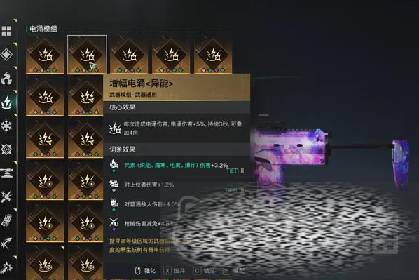 在模组选择方面,推荐使用瞬态过载模组。该模组不仅能显著提升电属性伤害,还能延长雷电debuff的持续时间。如果尚未获得瞬态过载模组,可以选择高频率电压作为替代。尽管它无法延长雷电效果的时间,但却能提升基础攻击倍率,从而有效弥补因高射速可能导致的失误操作。