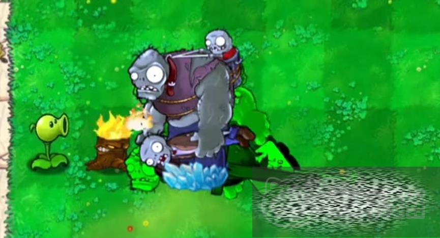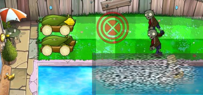 要是突然出现的巨人僵尸跳到花盆上面的话,我就会优先攻击第一个花盆。这样就无法继续使用加农炮了,就得要先放置一个花盆才行。另外玉米炮的攻击范围也很大,涵盖的范围较为分散,所以集中攻击力比樱桃炮会弱一些。