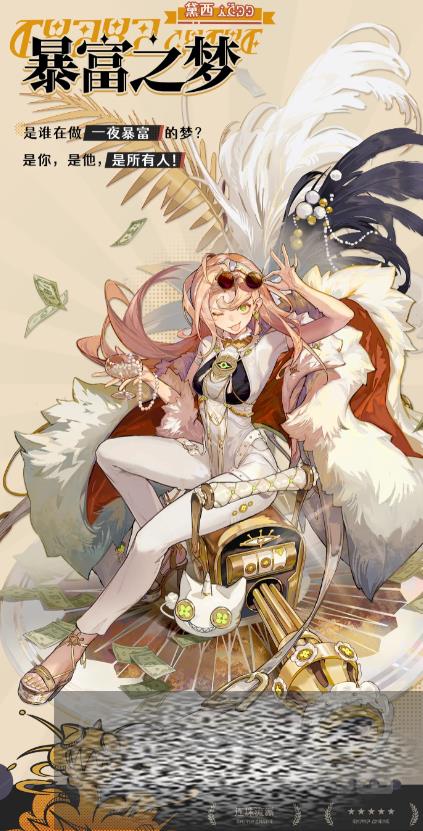 暴富之梦的名字叫做黛西,她的普攻可以长按一直发射金币、钻石或纸钞子弹进行攻击,释放期间自身可以缓慢移动,不过长按持续释放会消耗能量值;她的生存技会向指定方向翻滚一段距离,在翻滚的期间自身会处于无敌状态,并同时进行一次行运,行运就是随机在三种子弹的普攻模式中切换并回满能量值,要知道不同子弹伤害不同,如果能顺利刷出伤害最高的钻石子弹,敌人将毫无还手之力;她的特性技会根据当前的普攻模式,消耗全部能量值发射一次金币、钻石或纸钞炮弹,炮弹命中敌人会造成范围伤害,并重新分裂为子弹,造成二次伤害。