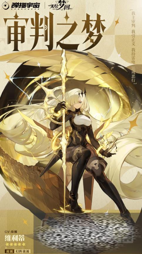 审判之梦的名字叫维利蒂,维利蒂的普攻会向前发起三段攻击,前面两段每次投掷一发疾电,第三段会连续投掷三发并附加雷罚造成伤害,她的生存技会向前闪现一段距离,在闪现期间免疫所有伤害,在闪现的终点召唤一道雷罚造成伤害,她的特性技会在短暂蓄力后向四周释放六个会移动的场地,场地会对沿途范围内的所有敌人造成法阵伤害。