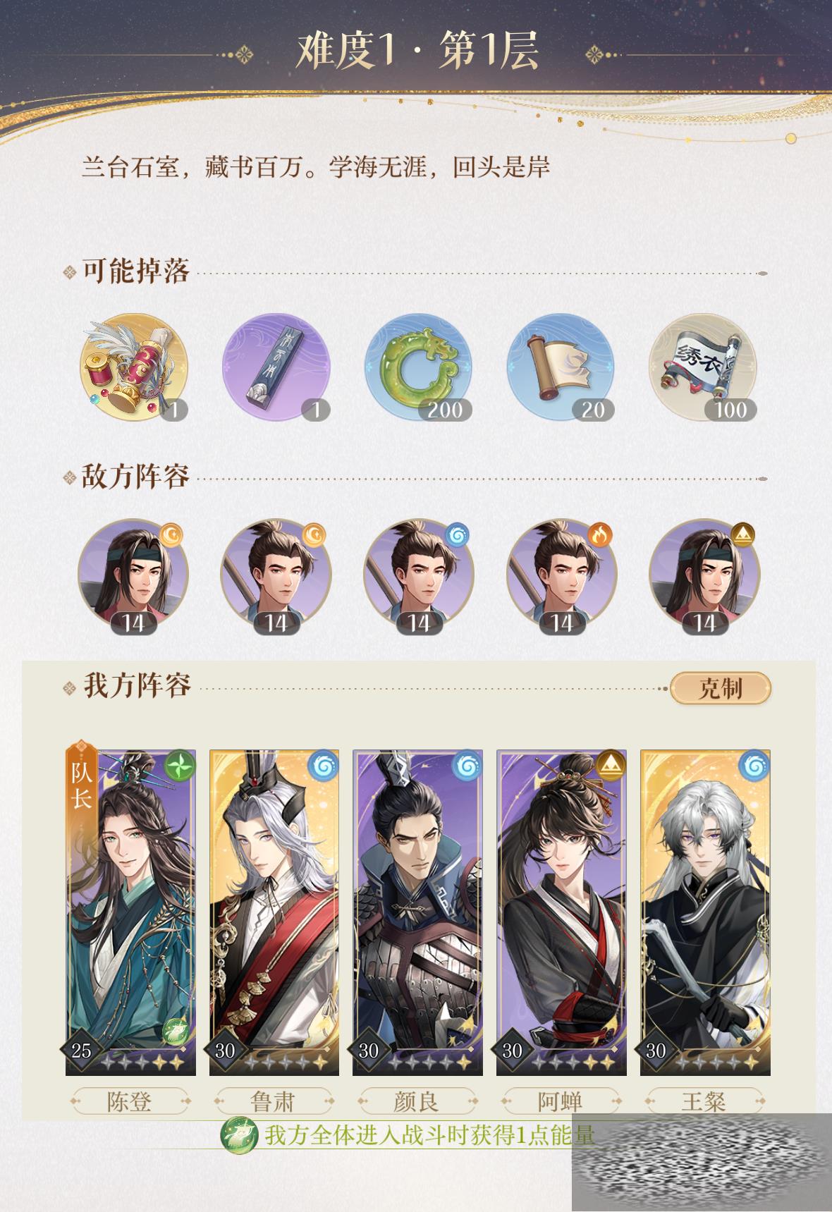 如鸢游戏中的兰台已开放第1期挑战,主题是男主角刘辩的只恐露水湿衣袖,默认开启的是一星难度。随着兰台更新,后续会陆续加入更多的男主角主题恋念副本,一般隔每2~3月更新一期。而玩家也不需担心打不完关卡,因为兰台设置可任选期数挑战,还有5个难度各30关可刷,解锁道具与玲珑玉都是充足的。