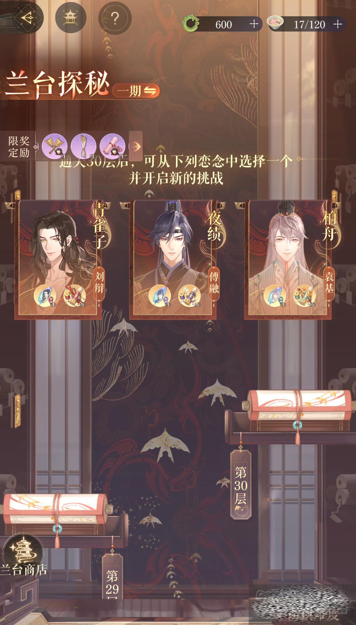 本期更新的兰台奖励有:青雀子、夜绩、柏舟的吉光片羽,分别对应开启,刘辩、傅融、袁基的恋念副本。当玩家进入30层以后,通关就可以从以上的三个恋念任选一个开启新的挑战。