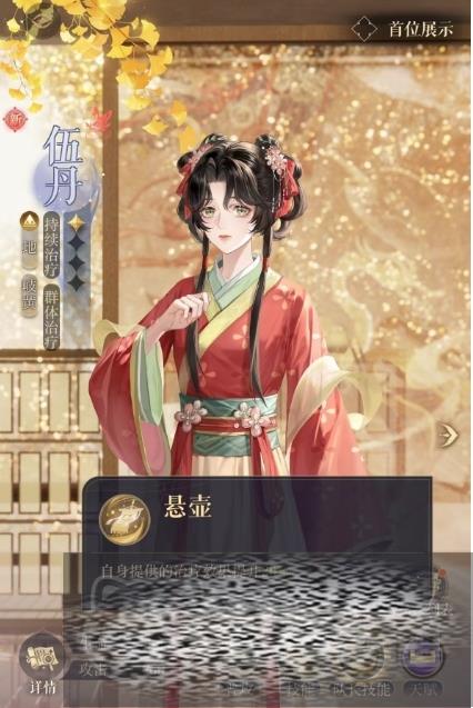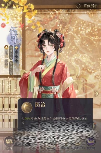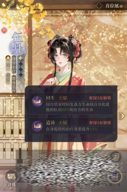 伍丹还拥有一个队长技能,能够将自身提供的治疗效果提升20%,这个技能在特定情况下非常有用,但由于其他岐黄角色的队长技能效果可能更为强大,因此很少有玩家会选择伍丹作为队长,此外大家关心的其他效果上面,其实伍丹还有两个天赋技能,第一个天赋在密探2星时解锁,可以在回合结束时回复我方生命值百分比最低的队员60%攻击力的生命,而另外一个天赋则需要在密探4星时解锁,此时她自身提供的治疗效果将提升15%。