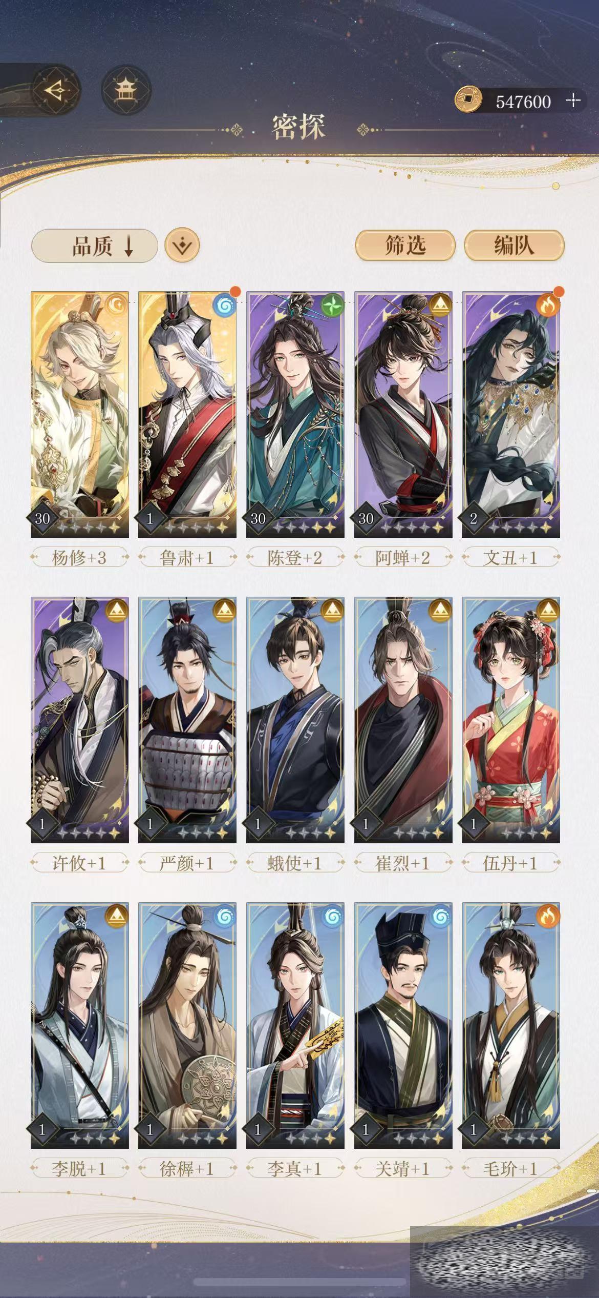 所以在使用这个角色时,让他担任队长也是比较合适的选择,另外就是需要配备合适的队友了,阿蝉,史子眇,陈登,以及颜良,就是比较适合初期时与他搭配在一起的密探,能够充分的将他的输出能力发挥出来。