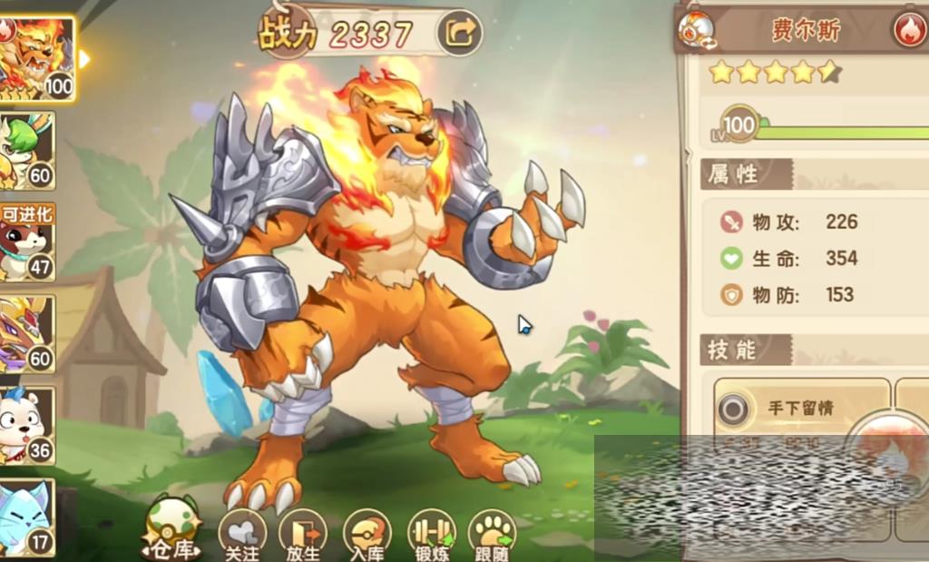 首先在游戏开局之后,系统会给你几个可以选择的宠物,小编在这里比较推荐大家选择老虎,第1个原因是它的攻击比较高,这样小伙伴们在推进前期主线剧情的时候会更加轻松一些。另外就是这只老虎是一个火系的精灵,目前游戏里高攻击的火系精灵是比较少的,因此小伙伴们不妨从前期就开始培养这个老虎,这样到了后期消耗的资源会更少一些。
