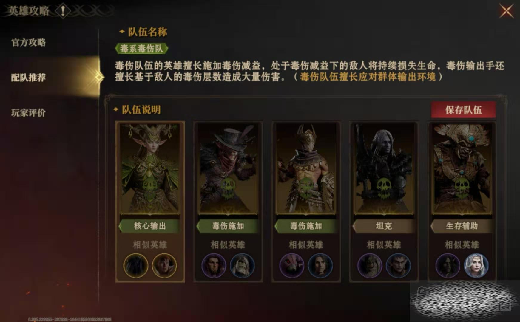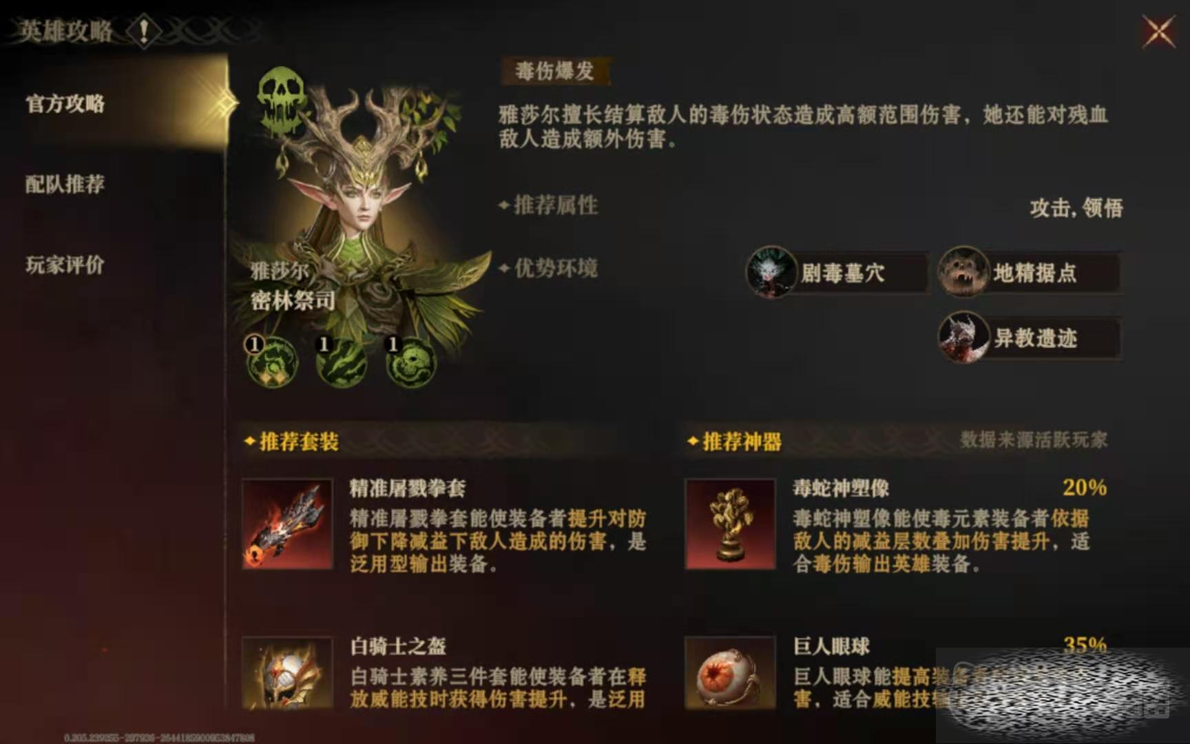 雅莎尔的特点很适合去充当团队的主力输出,不过也要看实际情况,如果对面的英雄克制它,那么就要及时调整自己的策略了,在组队的时候,要优先为其搭配毒系的英雄,这样可以达成更高的元素亲和效果,比如副输出可以选丹契或柯林,坦克用阿尔廷或者弗尔巴斯。