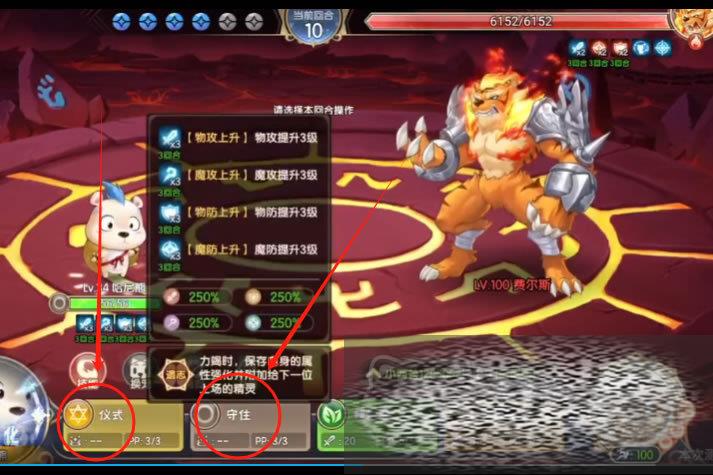既然费尔斯有自己加状态的技能可以消除给它带来的减防效果,那么一般的减防打法就不适合用来打它;但是我们可以换一个思路,不能减防但是可以给自己加攻击伤害,效果也是差不多的。所以这次战斗不需要小地鼠和小蜗牛这些,而是用上了哈利熊;主要是看中了他的两个技能以及保存自己的buff效果继承给下一位成员的特点,通过技能守住站住,然后释放仪式为自己添加各项攻防属性等级的提升。