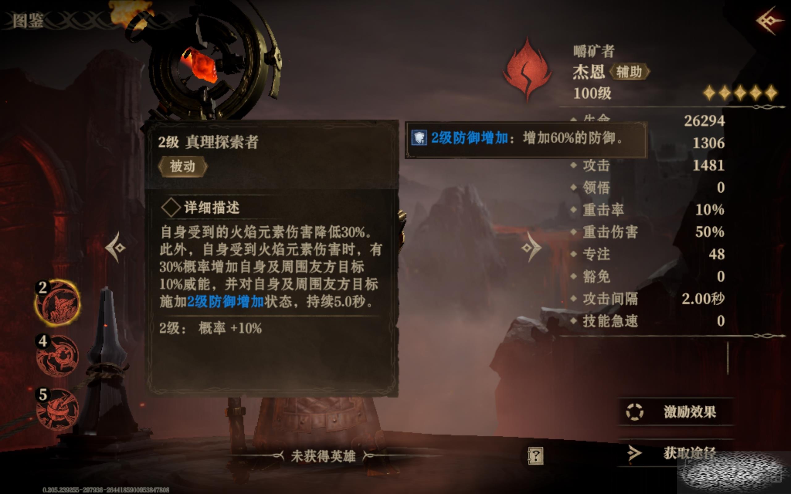 杰恩一开始是没有技能的,当它升到二级之后,就能解锁第一个技能真理探索者,这一招会在特定条件下自动触发,当杰恩遭受了敌人的火焰攻击后,可以降低30%的伤害,在面对火系攻击为主的敌人时,可以将杰恩放在前排和坦克一起抗伤,其他队友放到它的附近,就能享受到额外的防御加成。