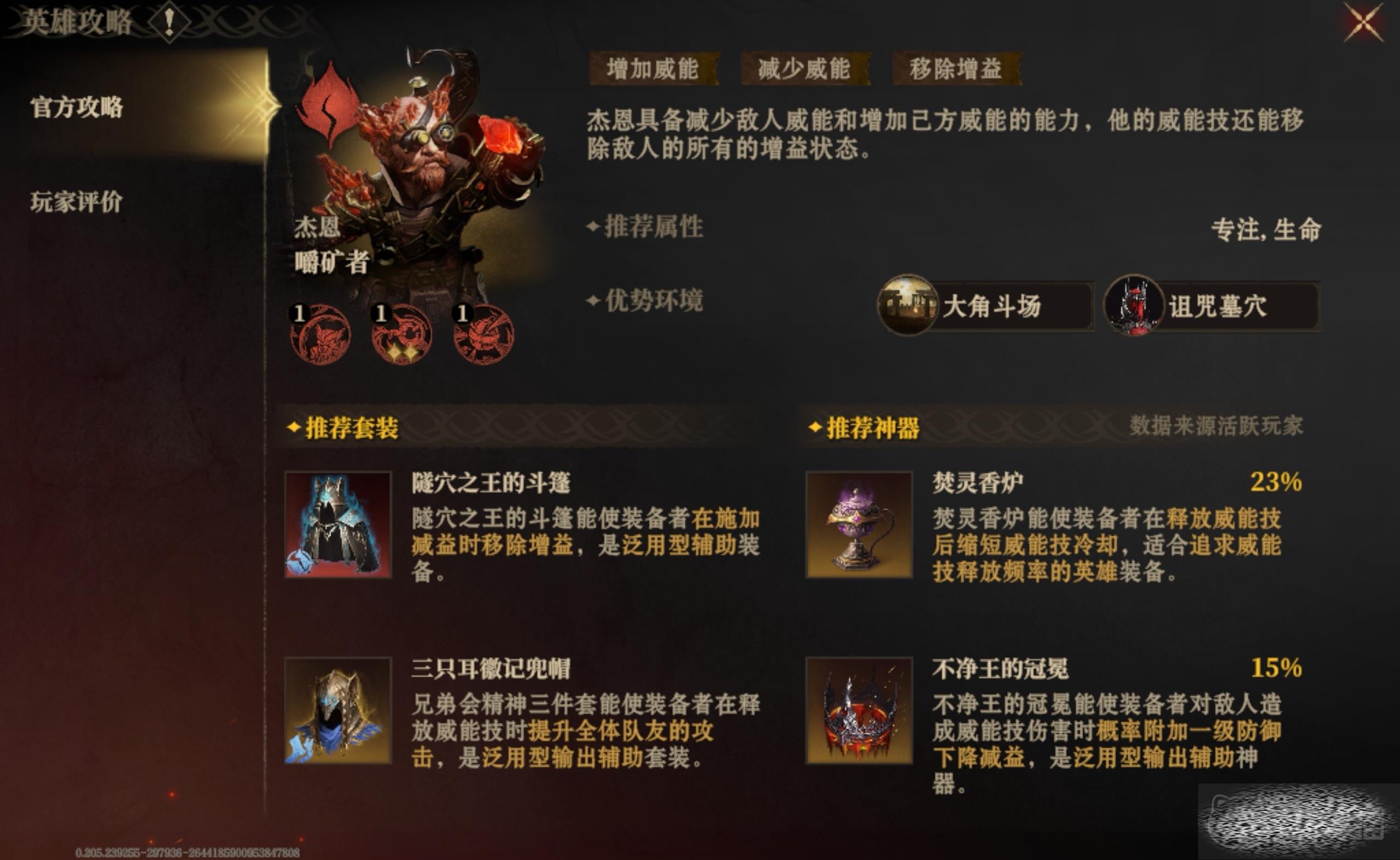 在给杰恩搭配装备的时候,可以优先考虑那些能增加生命值和防御力的,比如不净王的冠冕,也可以挑那些能增加攻击力的配件,比如三只耳徽记兜帽等等。