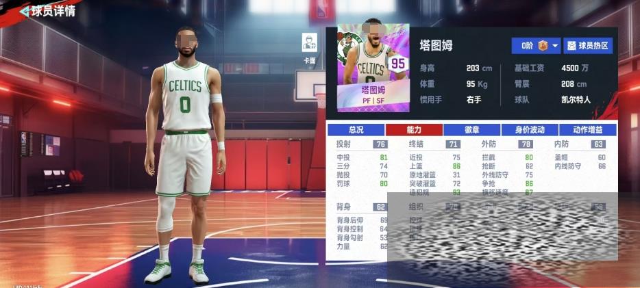 第二个就是塔图姆,从评分和身价的角度来看塔图姆是一位性价比极高的球员,他的总评分高达95分,而身价仅在240.00万左右,但是随着转会期的变化后期塔图姆的身价很可能会上涨,身体素质方面,塔图姆拥有203cm的身高和208cm的臂展,这为他在游戏中带来了很大的优势,技术能力上,塔图姆的中投效果尤为突出,基础数值高达81,这在游戏中是非常难得的。