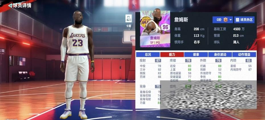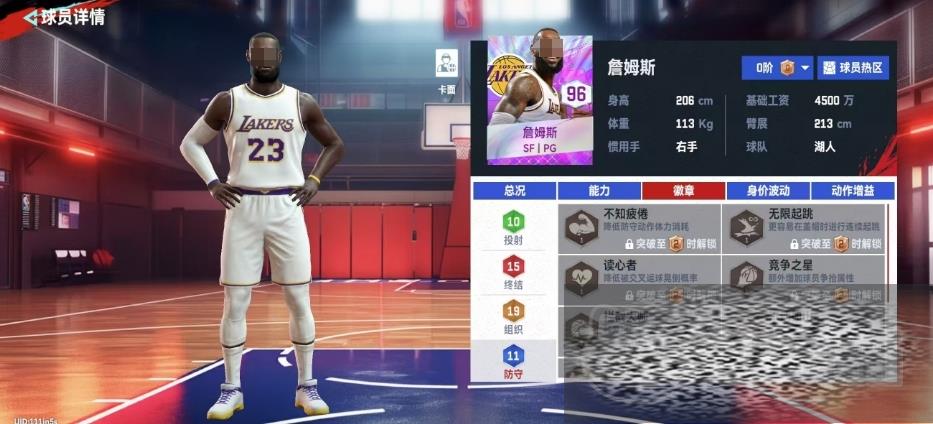 此外他的进攻篮板效果只有48,这表明在抢攻篮板方面可能不如其他一些球员出色,这也是玩家在使用他时需要注意的一点,但同时詹姆斯在游戏中的设定充分体现了他在现实中的篮球风格和特点,在徽章效果方面,他有一系列增强防守和进攻能力的特殊技能,不知疲倦的徽章效果可以降低防守动作的体力消耗,这意味着詹姆斯可以在比赛中更持久地保持高强度的防守表现,而不会因为体力消耗过快而影响表现。