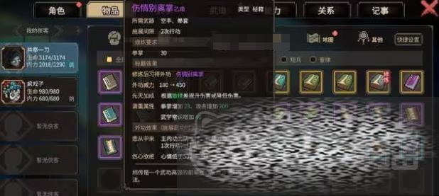 着重介绍的是伤情别离掌,如果大家的角色修炼的是阴性的内功,可以对敌人施加一次破绽效果,同时如果角色的心情低于50点,每降低1点心情就能增加1.6%的最终伤害,对练习野路子功法的朋友们来说非常好用。