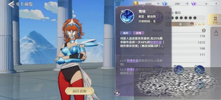 魔铃的被动技鹰啄能够在对敌人造成普攻伤害时,有25%概率额外造成一次48%的物理伤害,这个技能的效果随着星级的提升而增强,最高可将物理伤害提高至60%,并且触发间隔降低至0.5秒,Lv.2时理伤害提高至54%,再升一级就是物理伤害提高至60%,触发间隔降低至0.5秒。