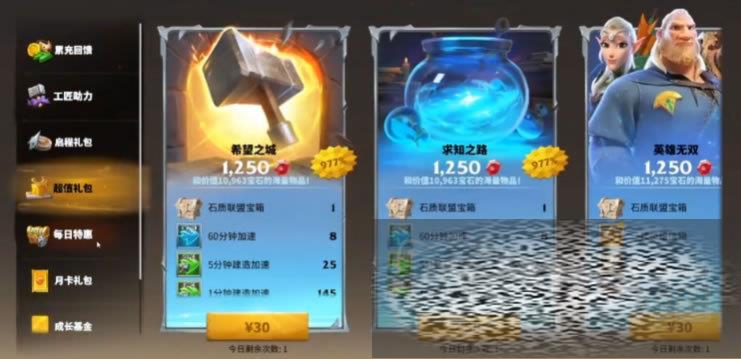 游戏中有很多弹出礼包,它的性价比是非常高的。弹出礼包一般是最具价值的,不仅有着大量的稀有道具资源内容,还含有不少红宝石,红宝石之后能够用于购买VIP等级积分。弹出礼包随着玩家的升级和功能开启会不断激活,但它是一个限时购买的项目,一般在1小时如果没有购买就会消失。