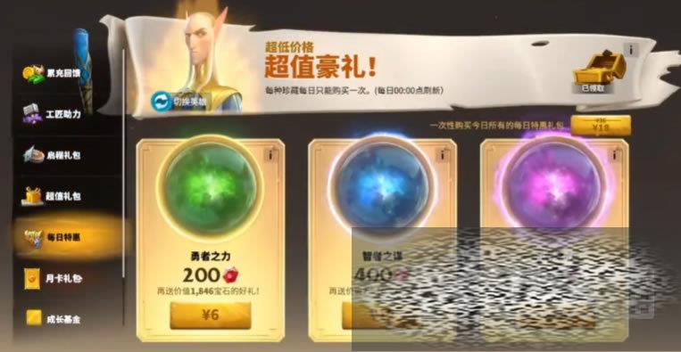 每日特惠也是一个相当具有价值的购买内容,每天18元的付费,可以一次性拿到大量超值资源,对于实力提升很有帮助。
