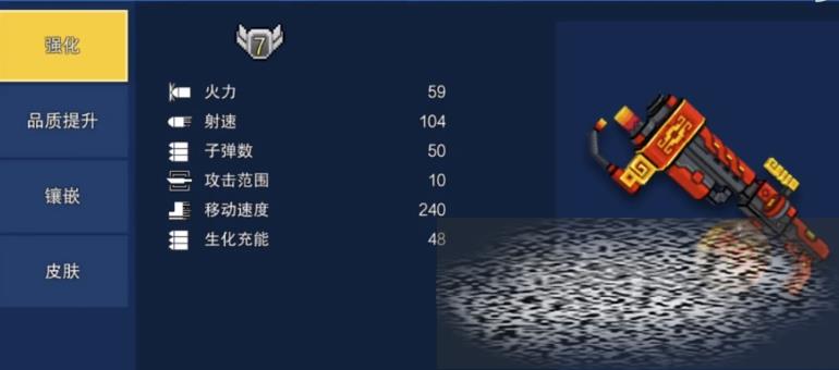 喷火器是游戏中比较有特色的一把武器。它和常规枪械武器不同,是靠喷火攻击敌人。从面板来看,强化满的喷火器火力是59,这个火力值并不低。子弹容量有50,移速也有240,算是一个不错的数值。