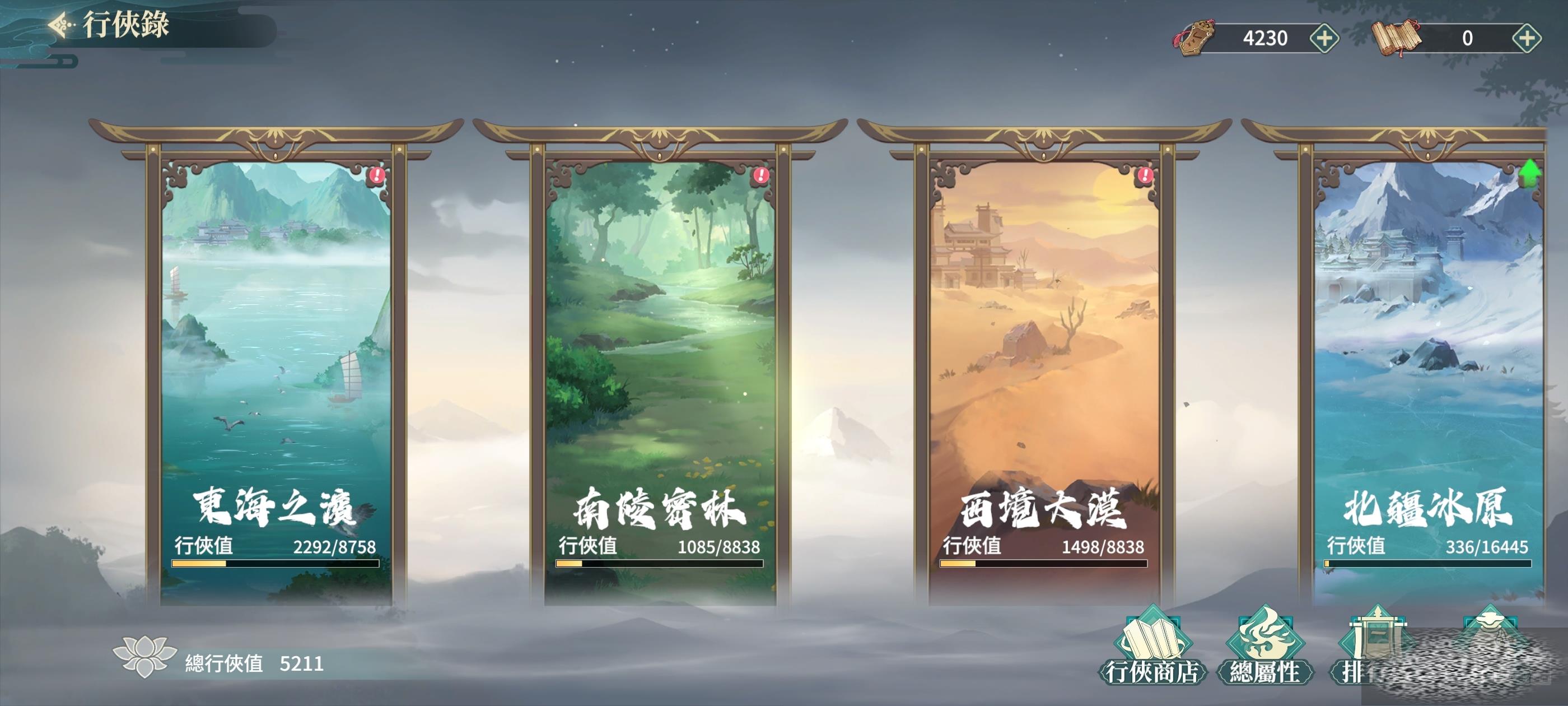 游戏中的行侠录,分成了东海之渡,以及南陵密林,西镜大漠和北疆冰原等,玩家们可以参与其中来增加行侠值一一的进行解锁,更好的升级,增加基础的属性,在体验这个玩法之前,需要注意玩家们前期最好主升一个。