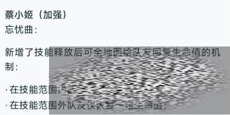 蔡小姬的二技能「忘忧曲」得到了显著加强。这个技能不仅可以对敌人进行控制并造成伤害,还能波及到其他在场的敌人,使他们陷入眩晕状态。更重要的是,新版本中的「忘忧曲」治疗范围扩大,实现了全图回血,极大地提升了蔡小姬的团控和辅助能力。这使得蔡小姬在团战中能够发挥更大的作用,为队友提供持续的治疗和控制支持。
