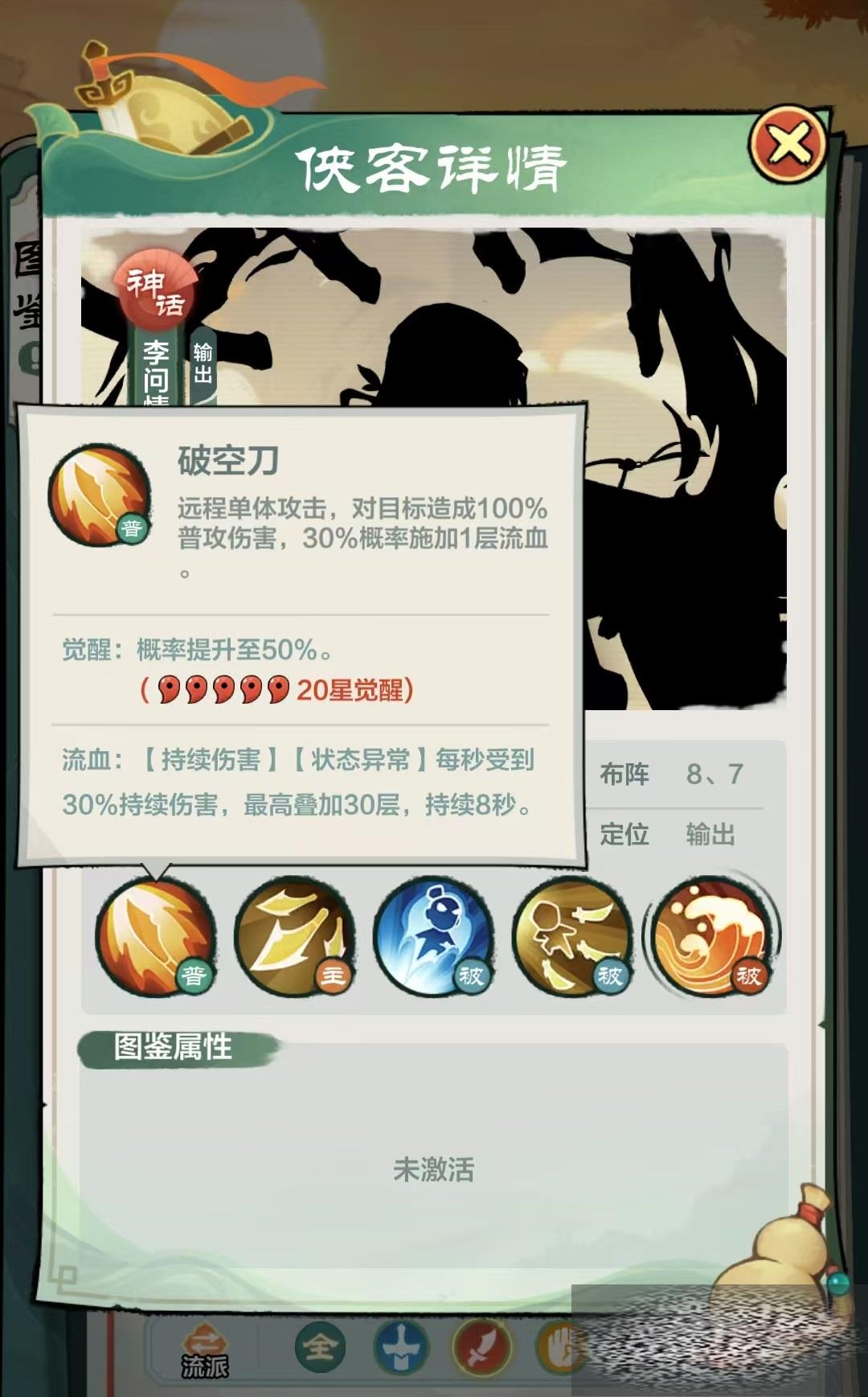 李问情具有一个普攻,一个主动技能和三个被动。先来看一下他的普攻破空刀,属于远程单体攻击类型,对目标造成100%普攻伤害,有30%几率施加一层流血效果,觉醒之后触发的概率提升至50%。流血属于异常状态和持续伤害,每秒钟会受到30%持续伤害,最多能叠加到30层,每一层持续8秒钟。