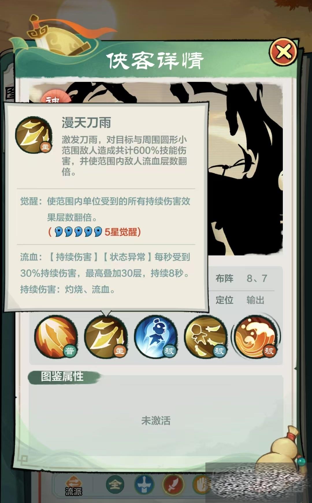 主动技能漫天刀雨,激发刀雨,对目标与周围圆形小范围敌人造成总计600%技能伤害,并使范围内的敌人流血层数翻倍。觉醒之后使范围内单位受到的所有持续伤害效果重复翻倍。这两者区别就在于觉醒之前只能对于流血生效,觉醒之后对其他持续伤害也能生效,例如灼烧等。第1个被动技能迷踪幻步,进入战斗后使自身攻击速度提升15%,觉醒之后额外提升10%自身攻击力。