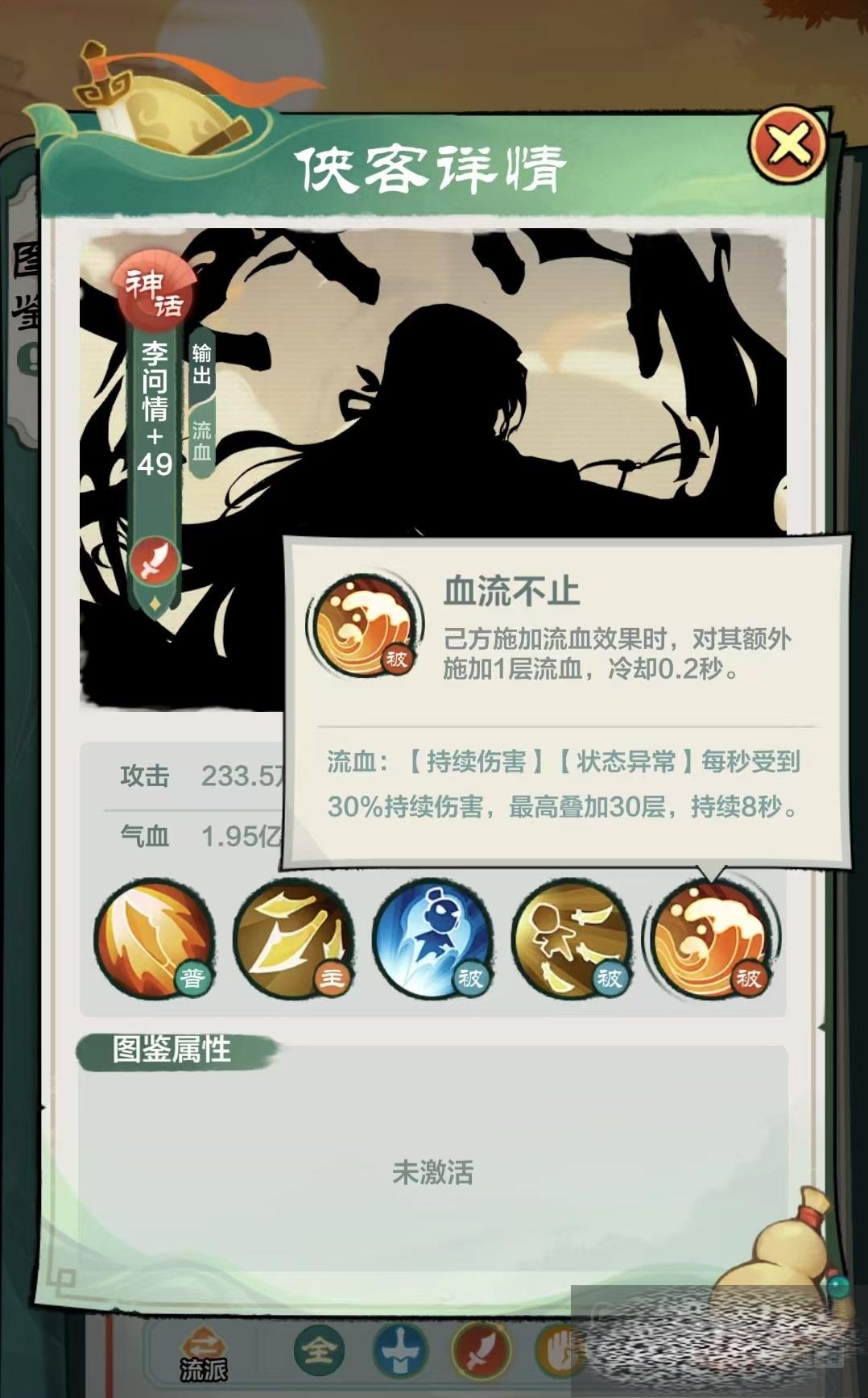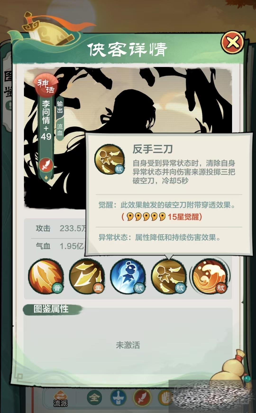 第2个被动反手三刀,自身受到异常状态时会清除自身异常状态,并向伤害来源投掷三把破空刀,冷却5秒钟,觉醒之后,此效果触发破空刀附带穿透效果。有了这样的被动,李问情就很难被异常状态所影响,冷却时间5秒钟并不算长。第3个被动血流不止,己方施加流血效果时,对其额外施加一层流血,冷却0.2秒。从这些主动和被动效果,大家可以看出,李问情主要的输出来源除了自身的主动技能之外,就是流血效果所附加的持续伤害,搭配的时候走的也是持续输出的路线。