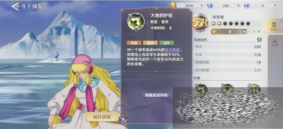 弗莱娅一般是后排SSR辅助角色,她有超强的治疗和保护能力,技能组合既多样又实用,弗莱娅的单体技能具有独特的灵活转变机制,她能够对单个敌军造成念力伤害,但当战场上有友军的生命值低于一半时,她的技能会巧妙地转变为治疗一个友军,恢复其一定比例攻击力的生命值,而弗莱娅的强大群体治疗技能更是她在持久战中显得尤为重要的原因,她能够使生命值比例最低的三个友军获得恢复,持续12秒,每秒恢复一定比例攻击力的生命值,随着技能等级的提升,每秒恢复的生命值和暴击等级也会相应增加。