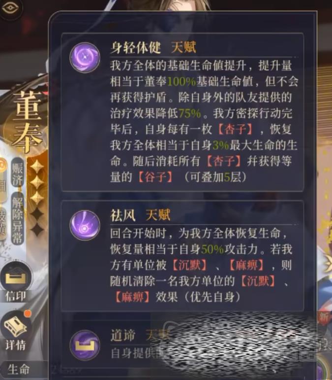 董奉是阳属性的岐黄角色,战场定位是赈济与解除异常,他的技能天赋如下: