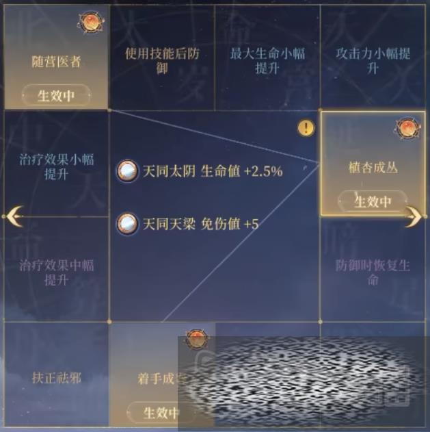 植杏成林是后期必带,效果可以让自身每使用三次普攻额外获得相当于5%的最大生命值回复,并且多获取一枚杏子。随营医者则是单辅助的时候选择,给全体队友加30%最大生命值与15%的攻击力。着手成春是下拉防御之后为全体队友恢复HP,恢复的效果相当于董奉20%的攻击力,随后再多获取一枚杏子。
