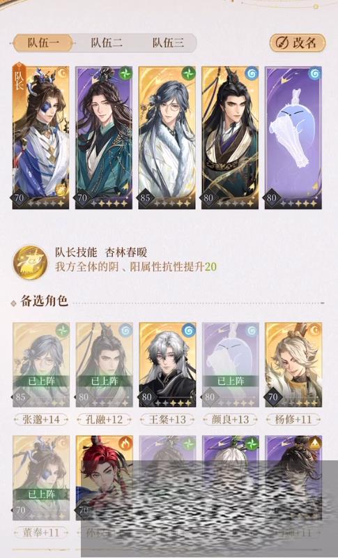 配队推荐:董奉+孔融+甄宓+dot输出手/普攻队输出。为了触发随营医者的效果,队伍里面不能超过两个龙盾加岐黄密探。