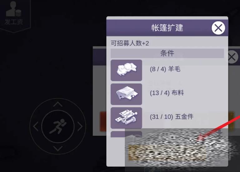 当然想要扩招队伍的条件现在也摆在了眼前,大家至少要准备四个羊毛、4个布料、10个五金部件以及其他材料。若是全都准备齐全的话,那么便可直接点击扩建即可。这些材料都可以选择在地图中的不同地方搜刮,不过这样会浪费不少时间。