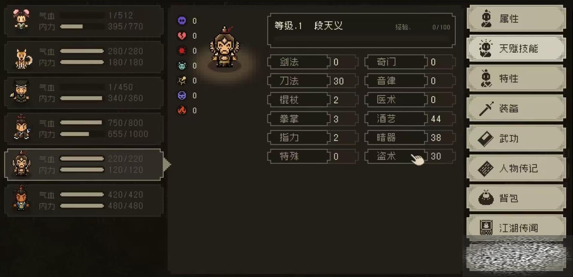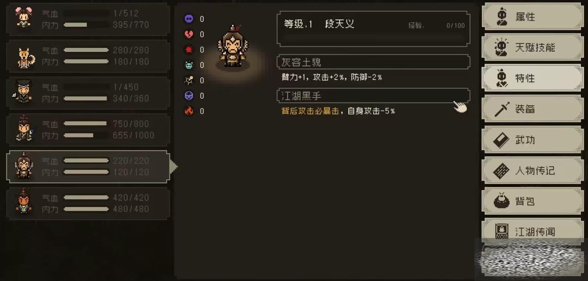 再来看一下段天义的天赋,拥有两个天赋,分别是灰容土貌和江湖黑手。灰容土貌的特点是加1点臂力,攻击加2%,防御减2%。江湖黑手在背后必定暴击,自身攻击减5%,江湖黑手这个天赋特性是非常有用的一类,玩家使用的频率也很高,段天义带有这样天赋是战斗中是非常有效的。