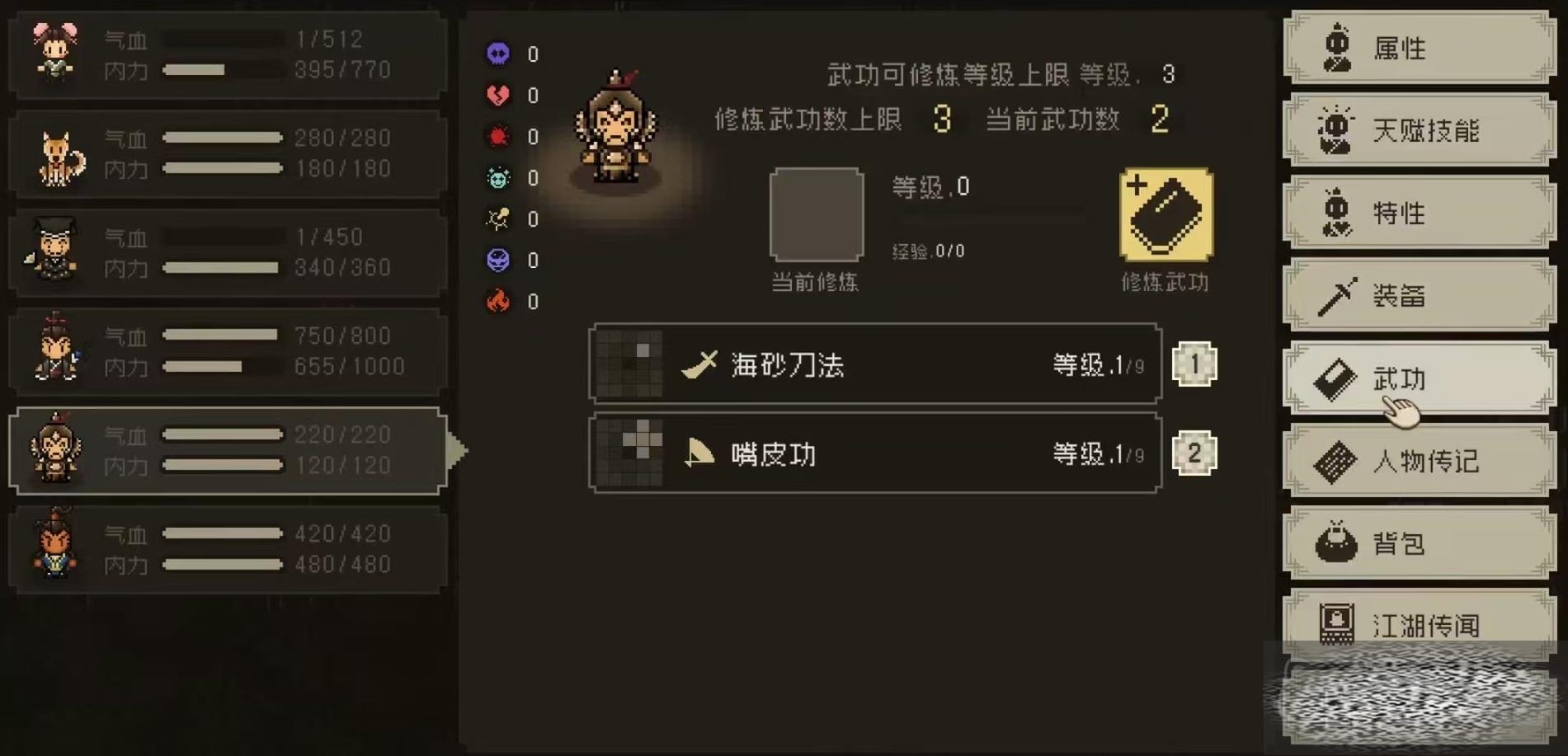 该伙伴的两种武功分别是海砂刀法和嘴皮功。海砂刀法属于三格单体输出类型,基本的刀法之一,暴击率5%,暴击伤害150%,50%几率中毒。嘴皮功是属于特殊功法一类,距离三格内,影响范围三格,暴击率5%,暴击伤害150%,90%的几率嘲讽敌人,持续三回合。