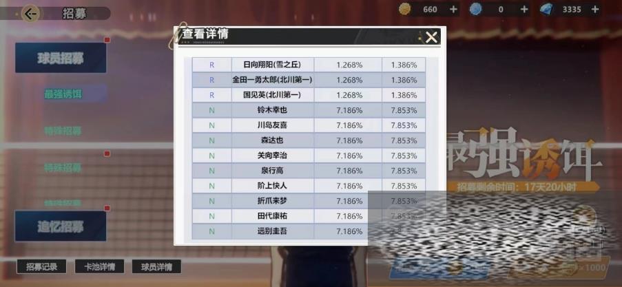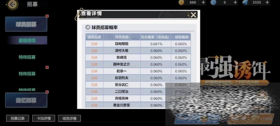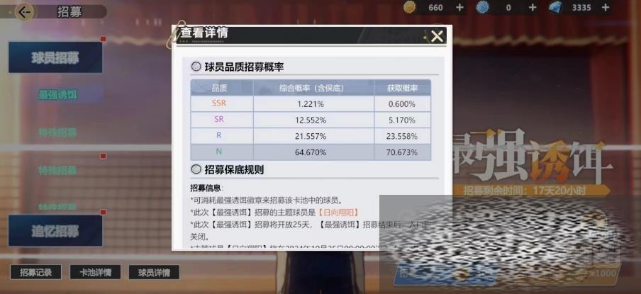不过,获得不同等级球员的具体概率是不同的,此外大家也可以尝试多次抽卡,相比常驻卡池来说,一般活动期间只要存在的卡池,都是有基础保底的,其他的角色被招募的几率也是更高的,这一点大家可以点开卡池的图鉴来查看每一个角色的获取几率哦。