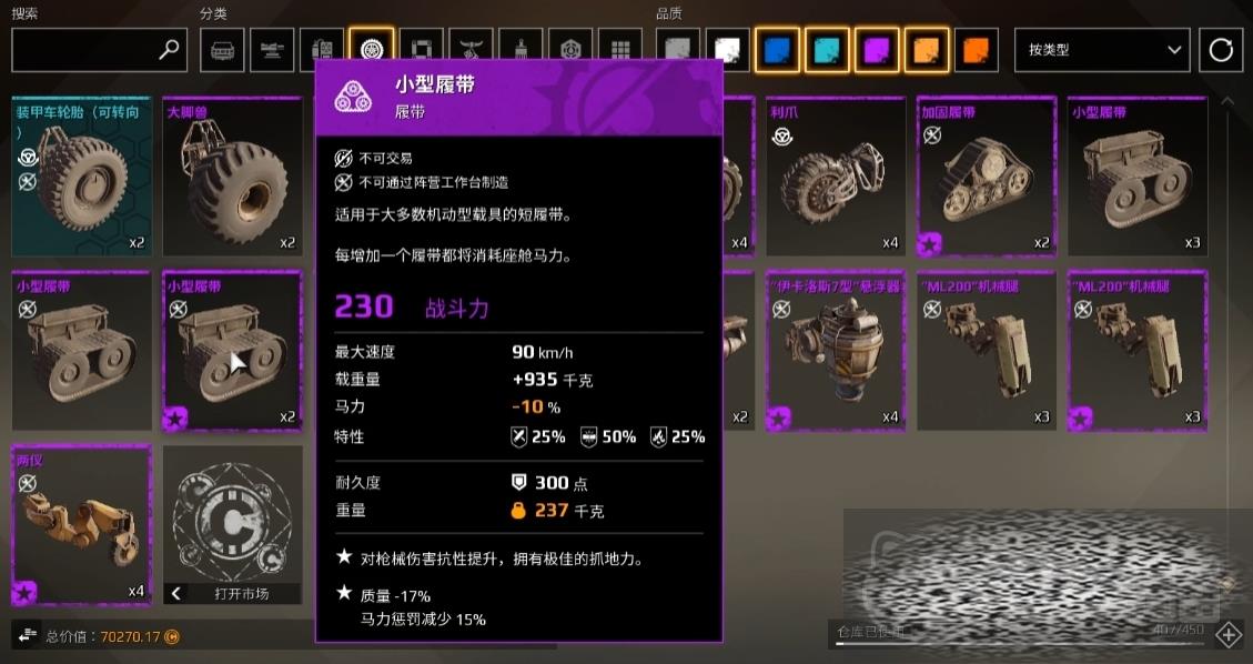 选择履带玩家要通过三个方向出发,首先第一种就是灵活性,像轻型坦克对于速度要求比较高,那么我们就一定要选择狂人阵营中的履带,这里面的履带自身重量是比较低的,在使用过程中能够减少损耗,而且它对马力的消耗也是比较小,能够最大限度确保战车足够的灵活,而且速度也是它的一大特点,此外玩家需要注意的是,并不是履带的品质越好,它的收益就越大,部分的紫色品质履带其实也是能够碾压传说级履带,带来很不错的收益。