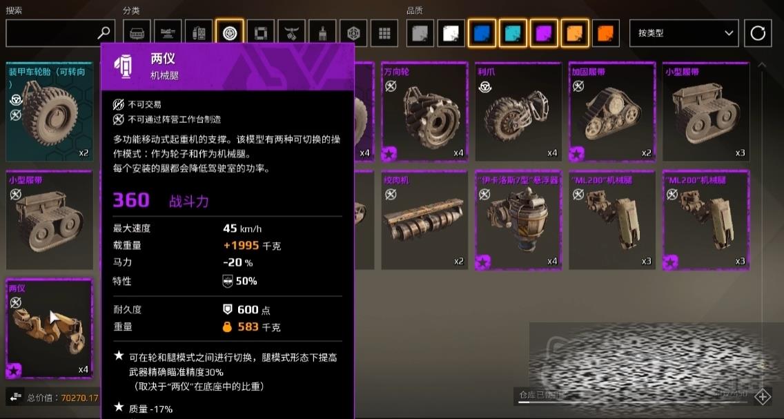 最后,玩家还需要考虑实战性以及转速效果,不同的履带在搭配之后都能为我们提供更多的加成,例如野战军的机械腿和新阵营黎明之子的月球车轮,这些履带对于那些比较颠簸的道路来说,是能为我们提供更高的稳定性,有效的规避传递部分伤害,并且有拥有无视地形的效果。