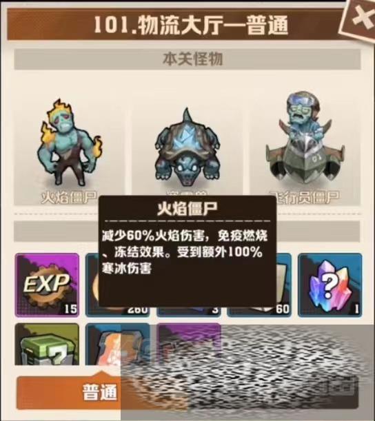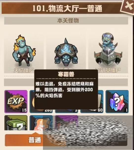 首先你要先把每一关的boss是什么特点了解清楚,每一关的怪也了解清楚,那么在本关,小怪分别是火焰僵尸、寒霜兽和飞行员僵尸,你只需要点击相应的怪,就可以看到它的特点。火焰僵尸会减少60%的火焰伤害,免疫冻结、燃烧,受到额外100%的寒冰伤害,寒霜兽是免疫燃烧、麻痹和冻结,阻挡弹道,受到额外200%的火焰伤害,说明它对冰火电都免疫了,但是它可以火焰伤害,那么你就要用火焰子弹去打它。