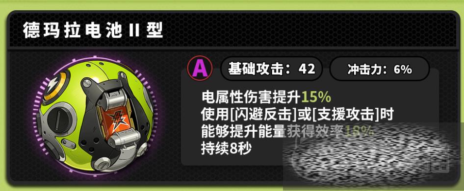 而在音擎方面,安比有个“量身定做”的音擎,叫做德玛拉电池2型,这是最合适安比配戴的音擎,使用这个音擎能最大程度发挥出安比的击破效果。如果你有这个音擎的话,给安比装上就对啦!但是这个音擎的获取途径比较难,很多小伙伴都表示获得这个音擎的方式太难了,有没有可以平替的音擎。但是,这里我们要知道,德玛拉2型电池是最适合安比的音擎,任何音擎都无法替代其效果,其他音擎只能是在还没获得德玛拉2型电池,过渡的时候使用。