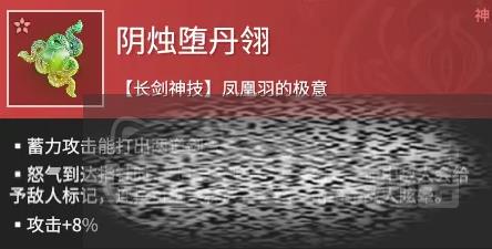 阴烛堕丹翎属于是长剑神技,能加8%的攻击力,还能让长剑的蓄力攻击多打出一道剑气,且当魂玉的怒气值到达指针的时候,还能再新增一个长剑平击招式,命中目标的话则会在他身上留下一个标记,连按可以持续释放,并在最后一击让敌人眩晕。