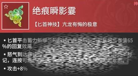 绝痕瞬影霎能让匕首新增一个二段招式,且最后一击能得到回复效果,但怒气达到时还会再新增一个三蓄招式,对敌人使用冲刺并留下一个标记,连按可以连续进行释放,并在最后一击的时候让敌人身上的标记进行攻击。