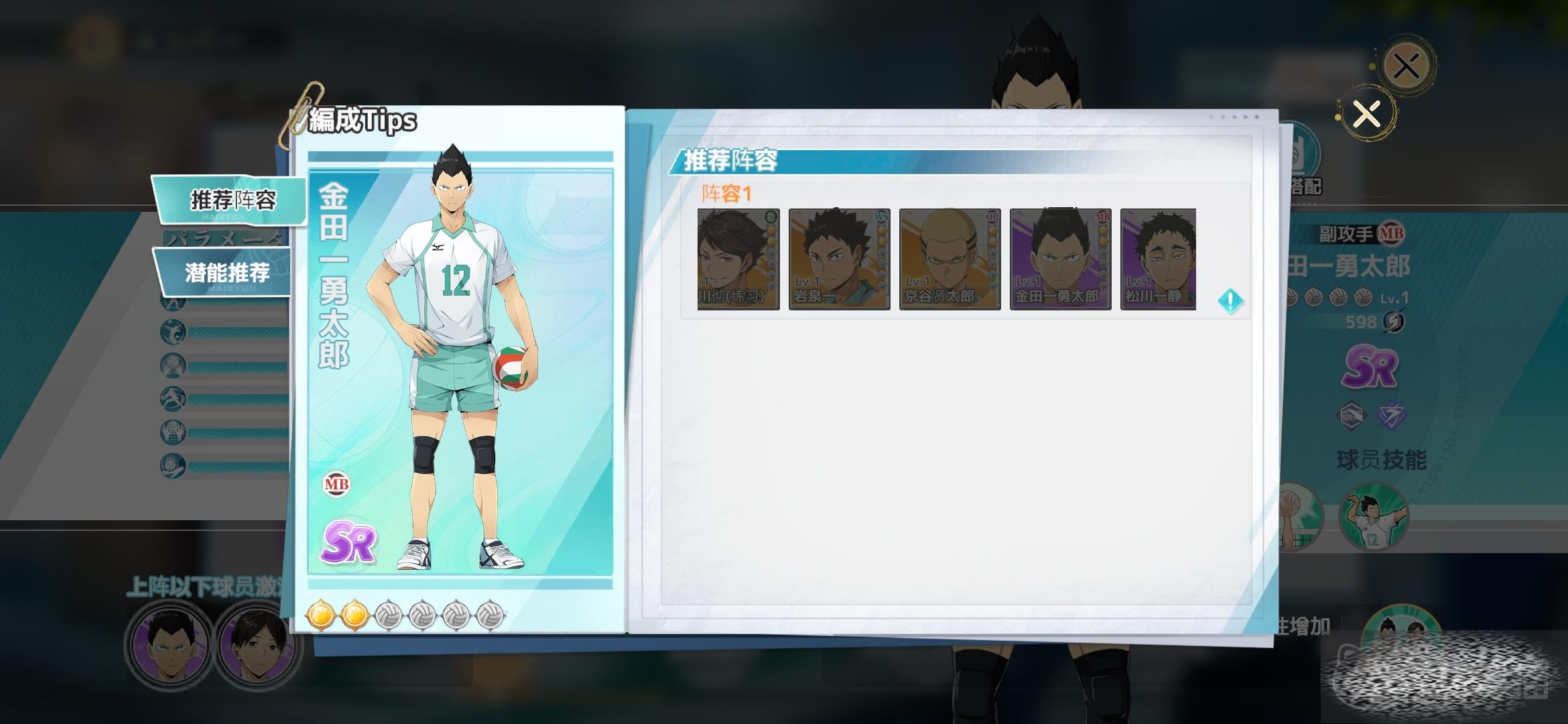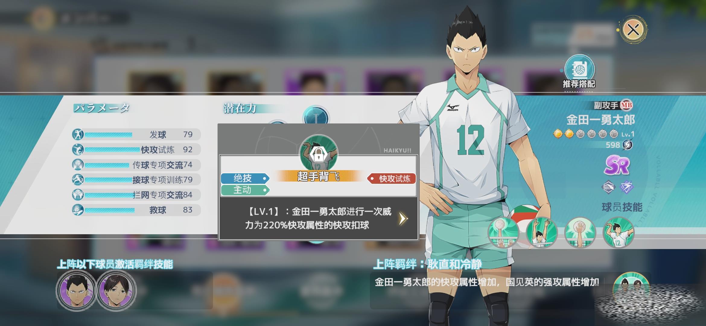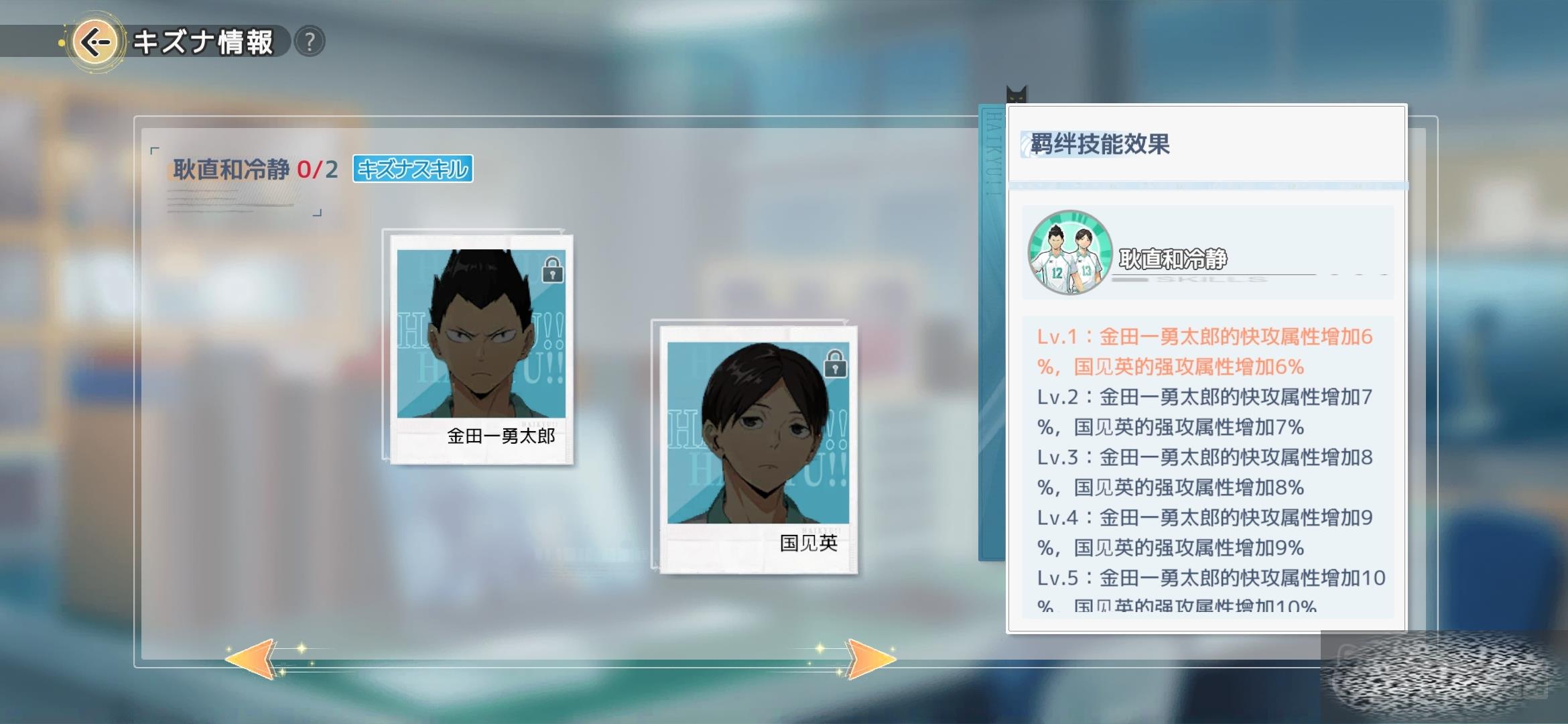 金田一勇和国见英在游戏内的上阵羁绊为耿直与冷,前者增加快攻,后者增加强攻。所以在阵容搭配上他们两个是必不可少的,其次就是尽可能的上橙卡及川彻和京谷更大程度的发挥金田的削减拦网威力。