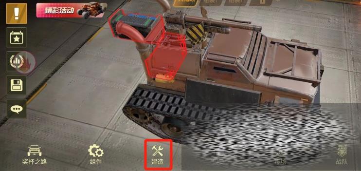 首先在游戏主界面的底部,大家进入建造就可以开始装配每一个部件,但是可以装配的部件都是要大家之前已经获取的,获取的部件效果越高,最后组装的整体效果搭配起来才会更强,进入了装配器后大家会发现视角的操作方式与主界面非常相似,上面单指滑动空白区域可以旋转视角,装配界面主要由四个部分组成,左上方的绿色部分显示的是战车的详细信息,正上方的橙色部分是车库蓝图,下方的红色部分是部件选择区,而右上方的蓝色部分则是功能区。