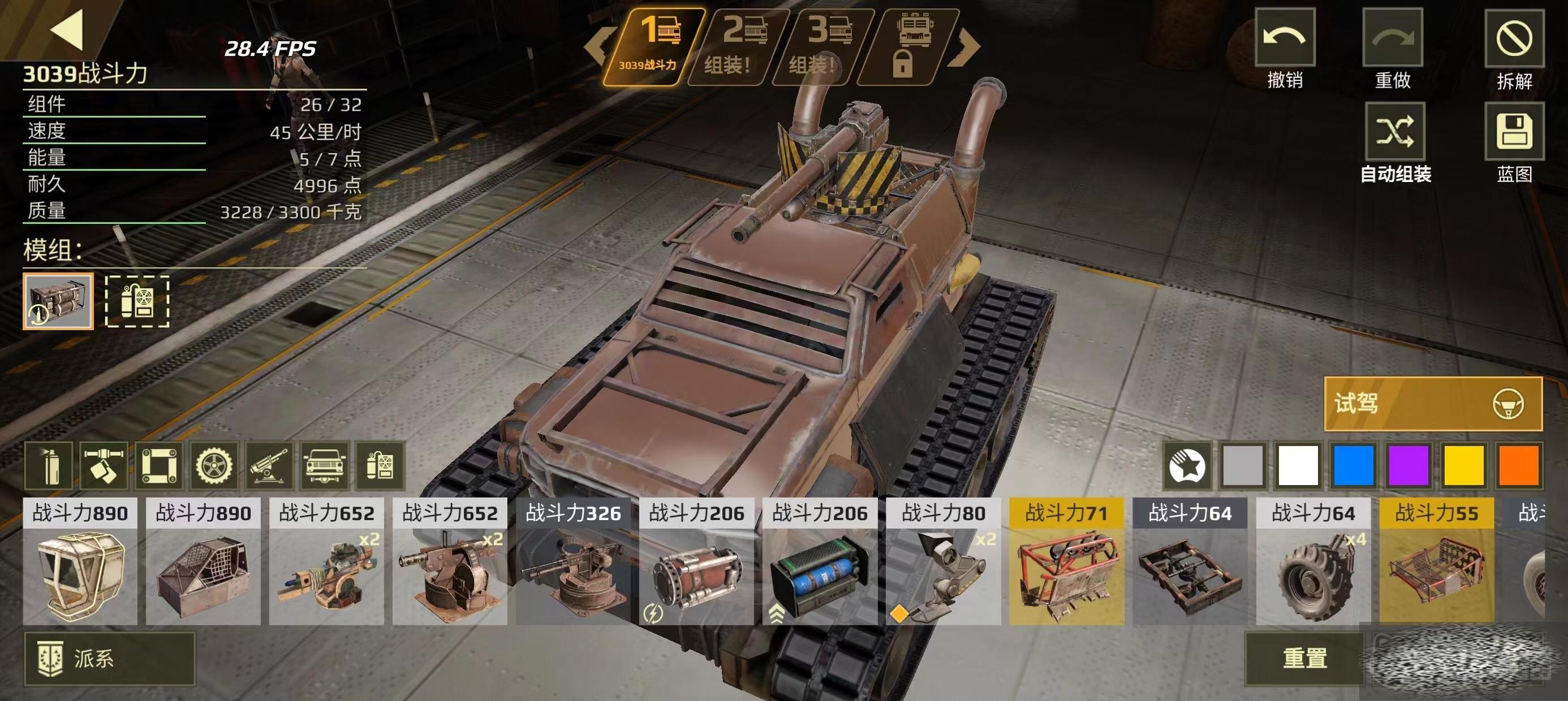 但是想要精确放置还需要大家仔细查看,根据转向模式或是移动模式大家都是可以看出来的,这样战车会变成半透明的效果,大家就可以更好的关注每一个部件的位置,只要是在战车框架当中放上每一个部件,保证承重数值不超过规定数值大家就可以完成战车的装配啦。