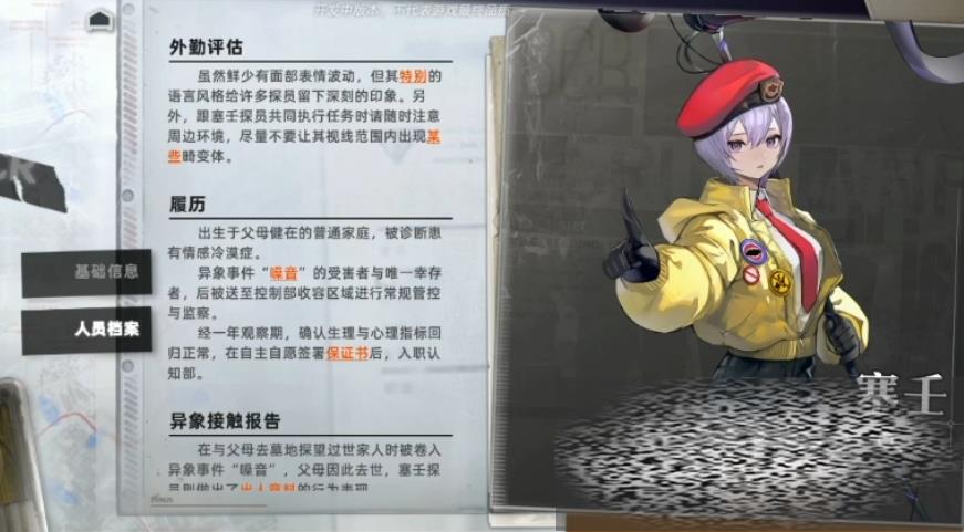 塞壬是一个因异象事件噪音而失去家人的幸存者,这一事件对她的心理和生理造成了深远的影响,原本塞壬跟她的父母和妹妹生活在一起,直到异象事件发生,在一次家族墓地探望过程中,他们被卷入了这一灾难性的事件,其中有一种异象实体对其视线范围内的所有生物进行无差别的攻击和捕食,所以塞壬的家人不幸遇害,而她则是唯一的幸存者,事件结束后,塞壬被送到控制部收容区域进行常规管控与监察,后期在自主自愿签署保证书后,她被允许加入认知部,开始她的探员生涯。