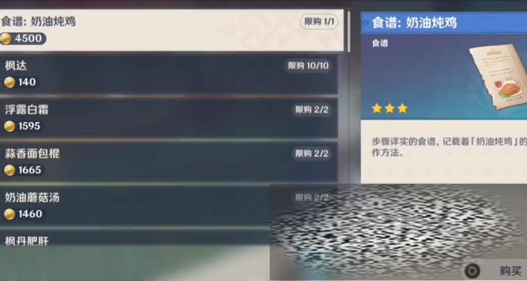 在原神4.8里面新增了两个食谱,一个食谱是奶油炖鸡,另外一个是香馥繁味,如果想要获得奶油炖鸡的话,那先需要去德波大饭店,在这里会有一个名为桑格内地的角色,告知这个角色要购买菜谱之后就可以在众多菜谱里面选择奶油炖鸡。香馥繁味是角色艾梅莉埃的特色料理,只要操控这个角色进行烹饪就可以得到这个料理。