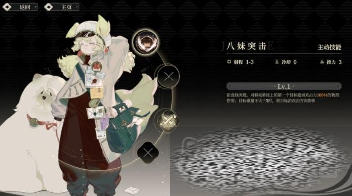主动技能是八妹突击,这也是目前八福最好用的一个技能,它允许八妹沿直线突进,射程为13,在这个品质当中的角色来说还是要稍微高一点点的,在突进过程中,八妹会对移动路径上的第一个目标造成相当于攻击力100%的物理伤害,这种伤害数值还是比较一般的,但是好用的效果是在后期,如果目标的重量不大于3的话,八妹还会将目标沿攻击方向继续推移,所以可以把敌人直接推到一个更后方的位置上面。