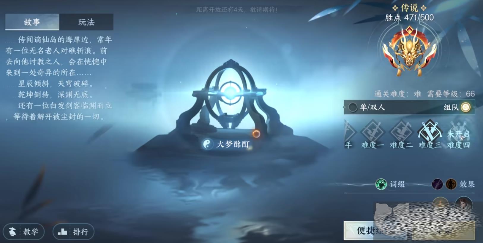 团队副本通关目标主要是舞阳城,可以单击跟AI组队,也可以跟其他玩家组队,总共通关三次完成目标。绝峰秘境要求通关江湖秘境与剑梦秘境,主要玩法是冲层闯关,限时通关层数越高,结算的奖励越多。同样可以支持单人以及双人AI队友进行挑战,单刷与多人组队奖励收益一样。