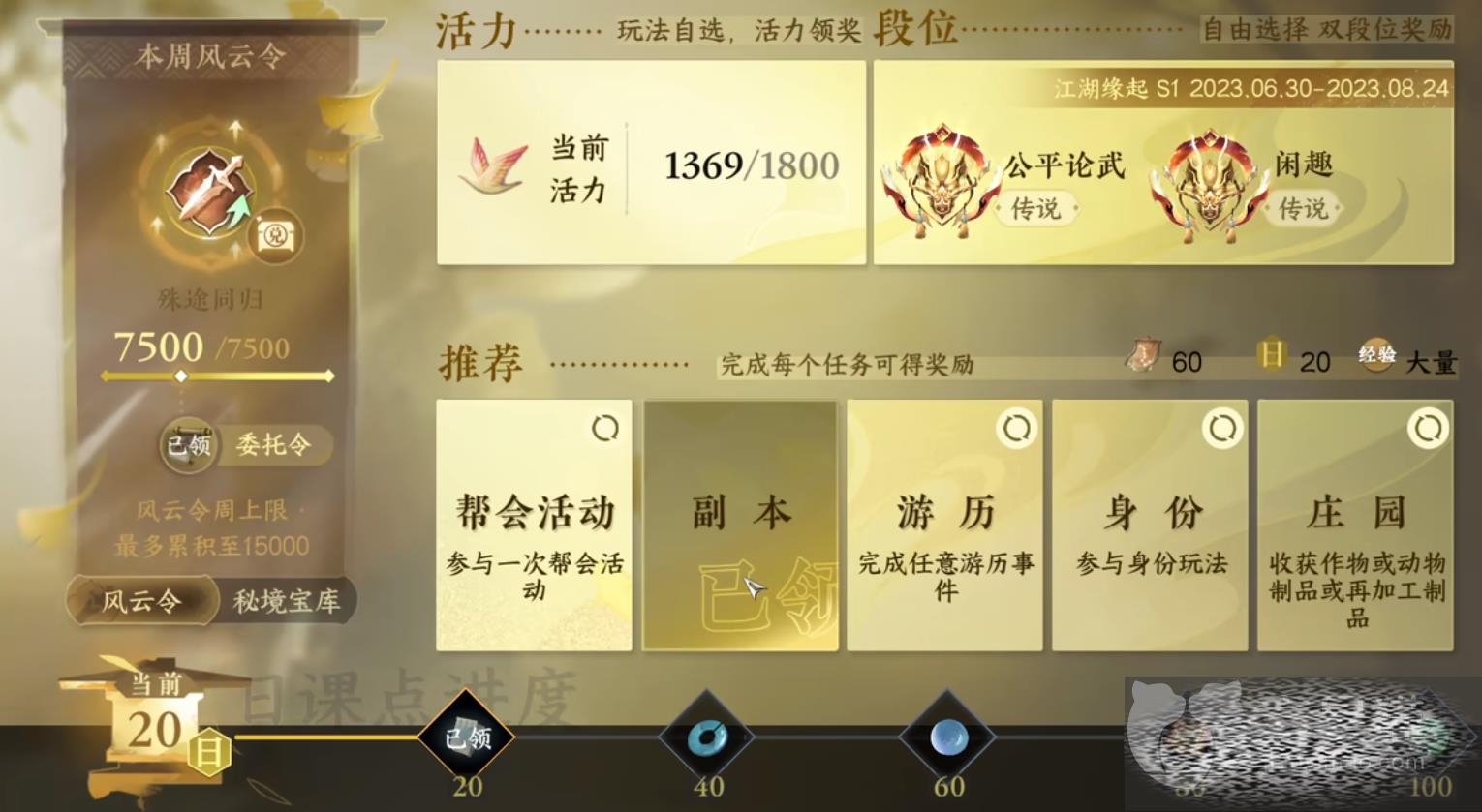每周一刷新秘境宝库的奖励,任选两件已解锁的奖励,每日登录做1~2样任务,基本能够解锁所有的条件。