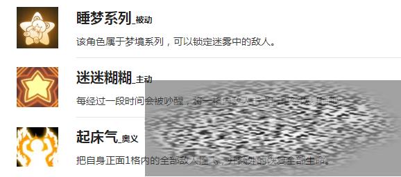 这是梦境系列的一个角色,可以把迷雾中的敌人全部的锁定,然后任意的发挥。迷迷糊糊属于主动技能,基本上每相隔一段时间全部都会被吵醒,一旦在吵醒之后就会击飞一格内的敌人,然后又重新恢复睡眠。