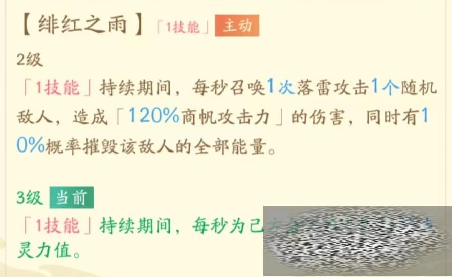 虽然外观看上去非常凶悍,但是自身在战斗中其实走的是生存辅助,可提供各种增益作用,并不如大家想象的那样是强势输出。绝技绯红之雨,召唤出绯红之雨,在持续期间可以恢复我方全体目标生命值,最多能持续8秒钟,通过提高技能等级还能获得额外灵力恢复。另外在持续期间会每秒召唤出落雷随机攻击一名敌人,对敌方也能造成少量伤害。