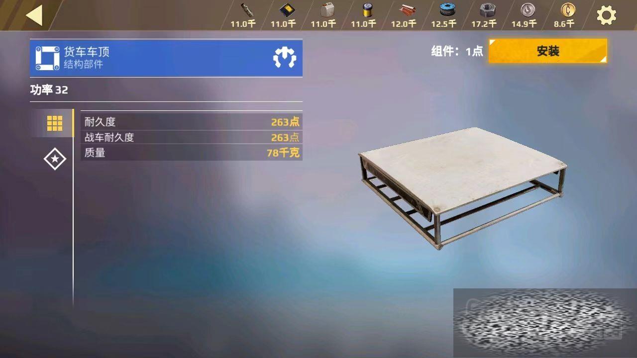 在创作的时候,将结构组件按照规则分为穿透板、撞击板和血量板这三种类型,这也就构成了创作过程中的整个板件系统。先来看一下血量板,顾名思义就是指具有可提升耐久度的部件。该属性代表这些部件可以提升载具的对应耐久度,通过在战车上进行装配,可以有效提升生存能力。例如小编下图介绍的货车车顶,就是一个典型的血量版,它可以增加263点耐久度,安装好之后可以直接加成到战车上。